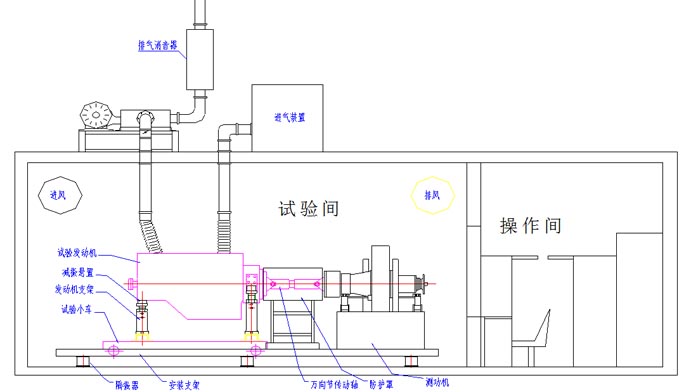 箱體吸隔音采用在箱體內(nèi)側(cè)墻面、頂面安裝吸隔音材料,對門、窗進行隔音處理。吸音和隔音墻壁要求在發(fā)動機運轉(zhuǎn)的所有工況下,測試間外1.5m處噪聲均不得超過85分貝,監(jiān)控室內(nèi)噪聲不超過75分貝。